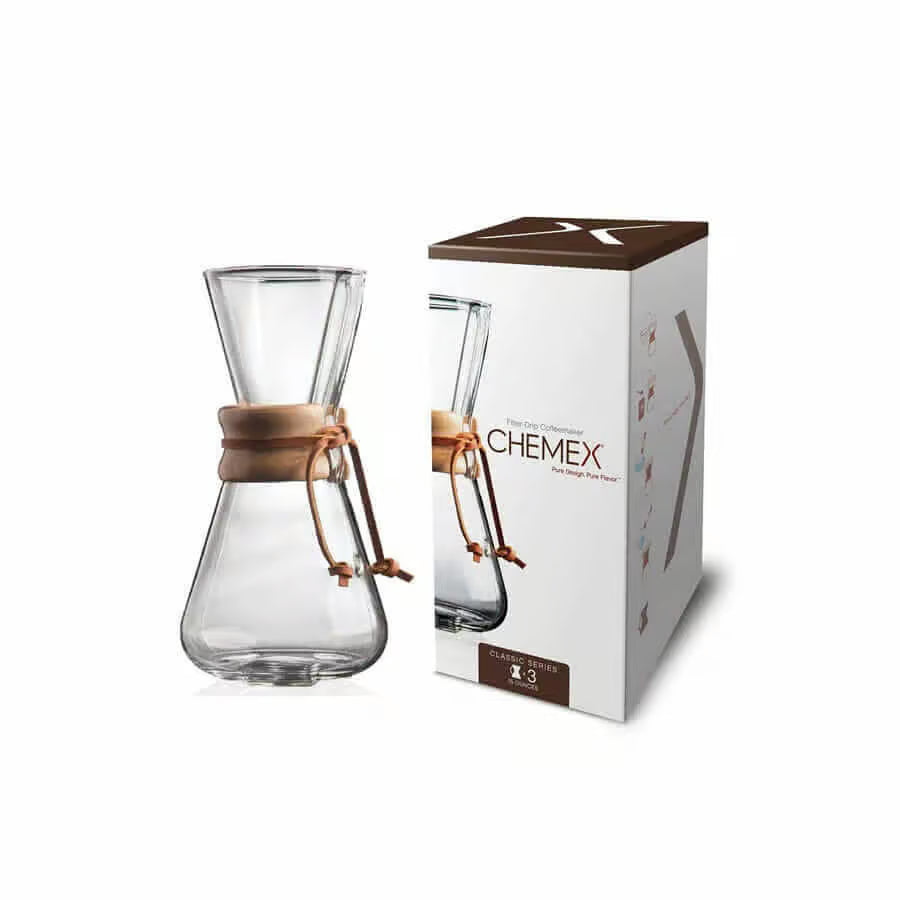 A Chemex de 3 chávenas é ideal para quem valoriza café de qualidade e um design intemporal. Compacta, elegante e funcional, oferece uma experiência única para preparar café em casa ou no escritório.