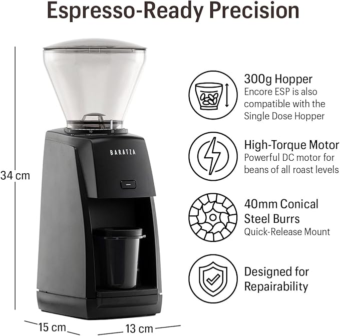 O Baratza Encore é um moinho de mós cónicas concebido para oferecer moagens consistentes em métodos de filtragem, prensa francesa e café de especialidade em casa. É reconhecido como a opção ideal para quem está a dar os primeiros passos no mundo do café de qualidade e procura simplicidade, durabilidade e bom desempenho diário.